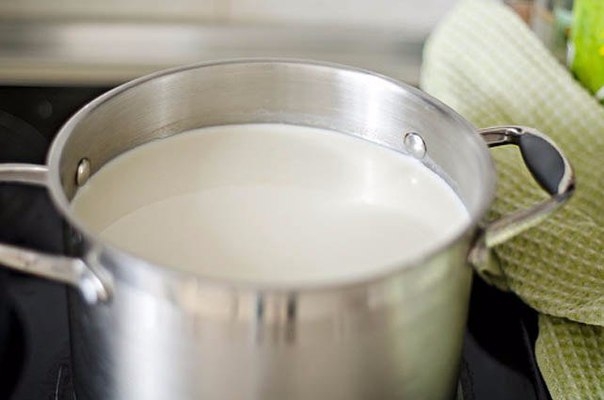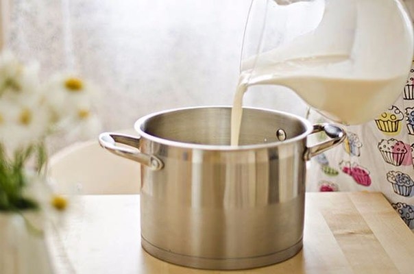 1. Вливаем кефир и молоко в идеально чистую кастрюлю.