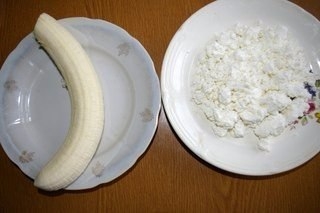 Размять банан вилкой, добавить к кашице творог и все перемешать.