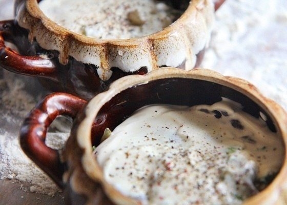 3. Сметану выложить поверх грибов ровным слоем и не перемешивая. Поперчить.