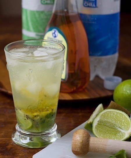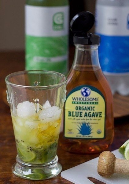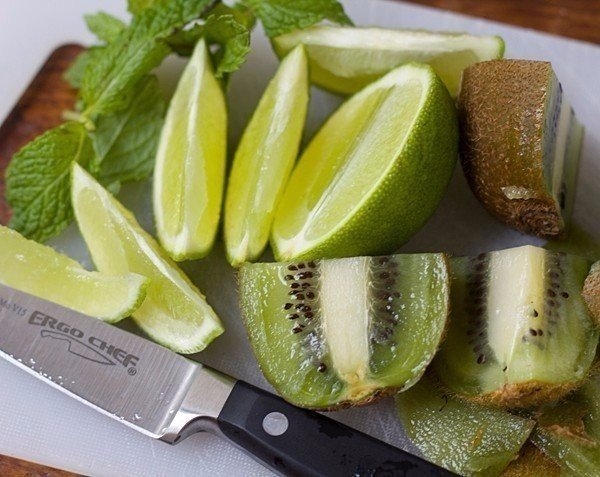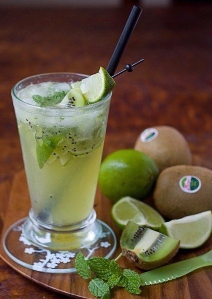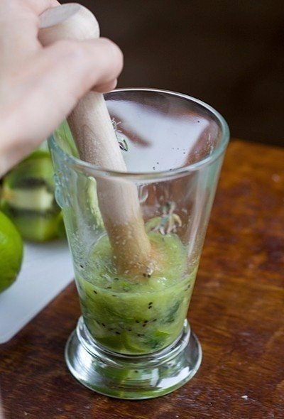 1. Киви, дольки лайма и листья мяты выложите в большой бокал. Толкушкой хорошо раздавите, чтобы фрукты пустили сок.