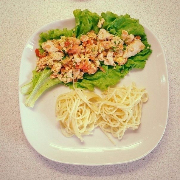 3) Небольшая порция отварных макарон с томатной пастой и сыром.