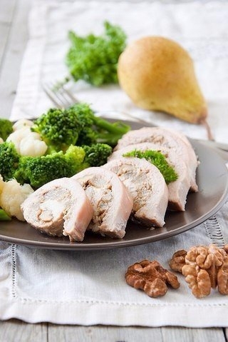 2. Смешать очищенные и нарезанные груши, грецкие орехи, тимьян и пармезан, посолить, поперчить. Выложить начинку на куриное филе, плотно завернуть в рулет.