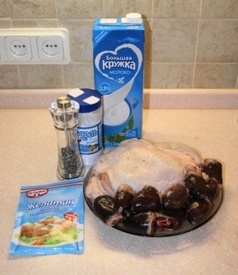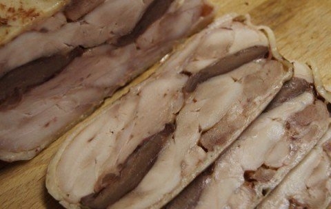 Сюжет прост: удаляете кожу, снимаете филе с кости, солите-перчите оное, присыпаете желатином и набиваете пакет из под молока, со срезанной верхней частью, этим "счастьем".