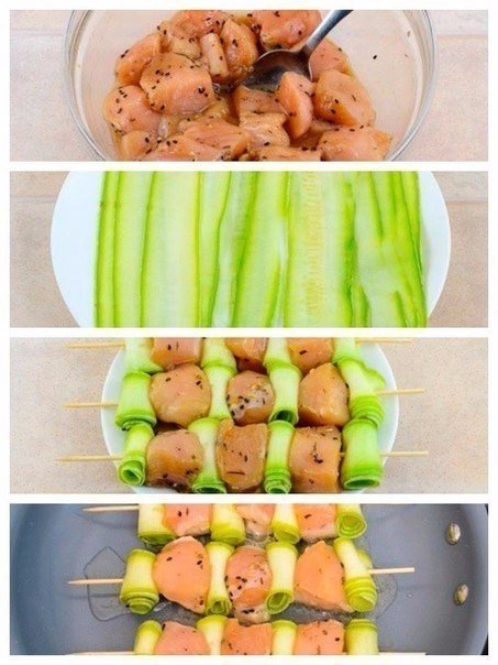 5. На шпажку нанизать пластинки кабачка, свернутые рулетиками, по очереди с куриным филе.