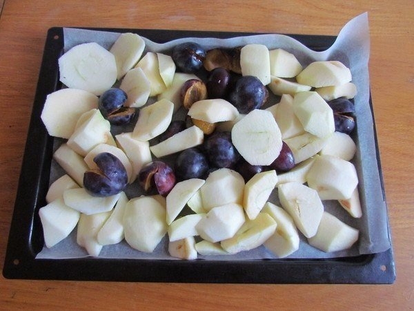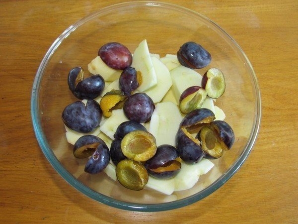 1. Фрукты вымойте. Яблоки очистите от шкурки, разрежьте пополам, удалите семена. Сливы разломайте на половинки, удалите косточки.