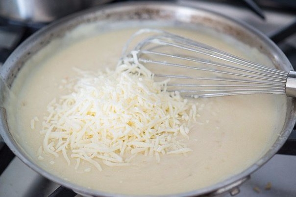 4. Влить на сковороду холодное молоко и как следует перемешать. Затем добавить тертый сыр и довести соус до однородной консистенции. При желании посолить и поперчить по вкусу.