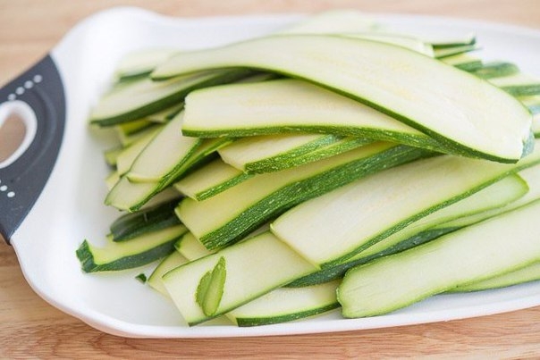 1. Куриное филе вымыть и отправить в кастрюлю с холодной водой. После закипания уменьшим огонь и варить до готовности. Кабачки вымыть, обсушить немного и нарезать вдоль тонкими ломтиками.