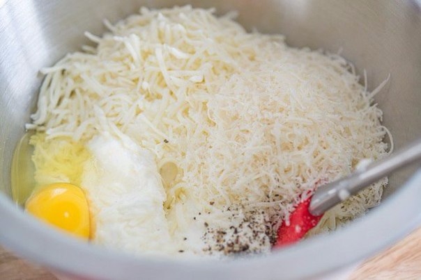 5. Отдельно соединить рикотту, яйцо, моцареллу и немного тертого пармезана. Посолить и поперчить по вкусу.