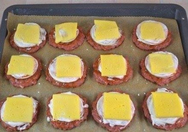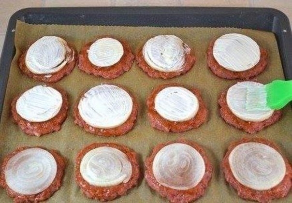 6. Луковицу почистить, порезать тонкими кружочками (количество кружков должно быть равно количеству получившихся котлет).
