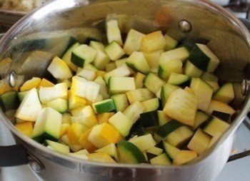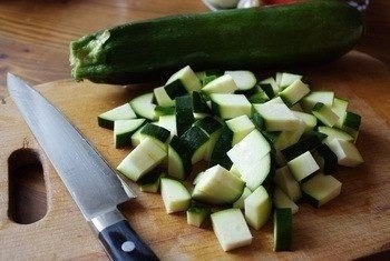 1. Кабачки очищаем от семечек, срезаем кожицу, если она жесткая. Режем на кубики.