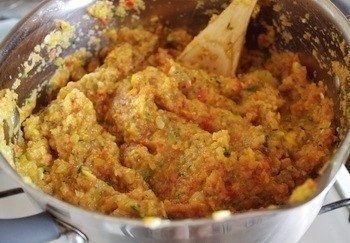 5. Выливаем в большую кастрюлю, ставим на маленький огонь и томим под крышкой, пока масса не приобретет нежную консистенцию.