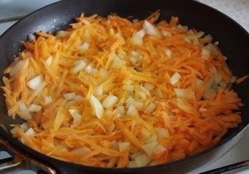 3. Морковь трем на крупной терке, лук мелко режем. Обжариваем на растительном масле также до мягкости. Тоже остужаем.