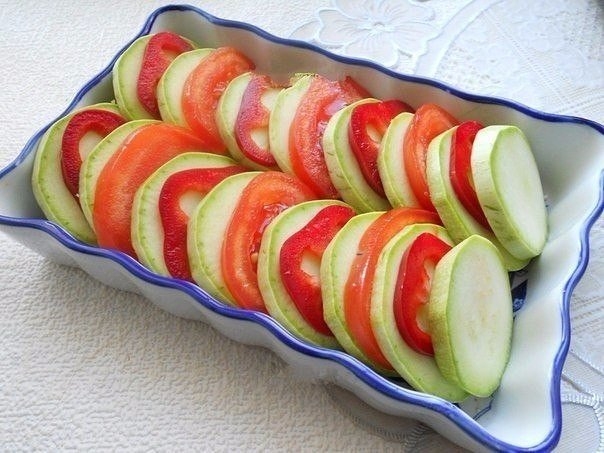 2. Сладкий болгарский перец очистить от семян. Помидоры и перец нарезать, как и кабачок, кружочками. В форму для запекания выложить нарезанные овощи вертикально, чередуя их друг с другом.
