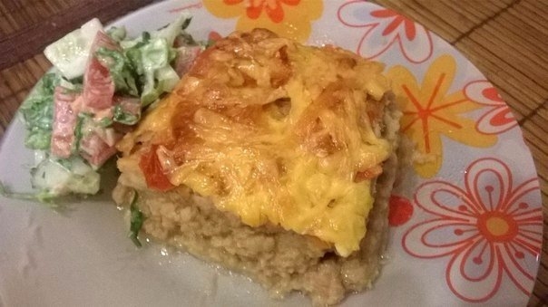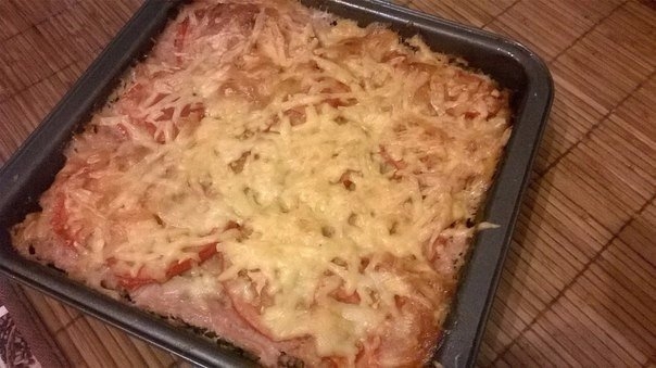 1. Взяла я пюре, добавила мясной фарш,именно сырой. Все тщательно вымесила руками, до однородной массы, вбила 2 яйца, вымесила. Соль, перец по вкусу (малышам просто соль,а так можно и специй добавить. 2. Выложила в форму, смазанную маслом. Сверху выложила тонко нарезанный помидор колечками, чуть присолила и сверху посыпала сыром.