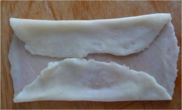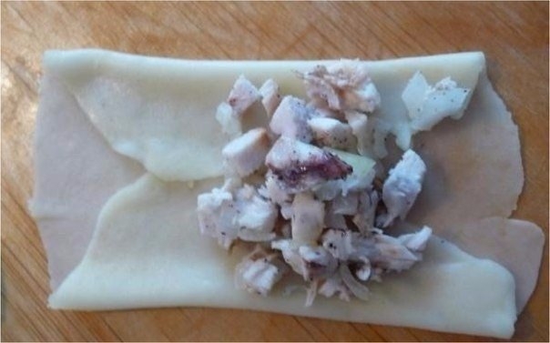 4. Делим тесто на 20 частей. Каждую часть раскатываем тонко, придавая форму круга. Затем заверните два края во внутрь. Выкладываем на край ложку начинки. Сворачиваем.