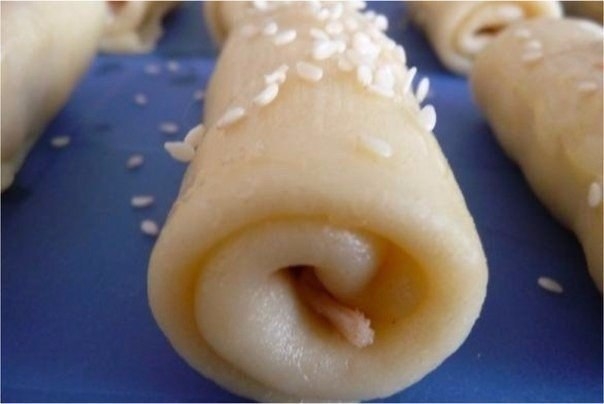 5. Выкладываем "сигареты" швом вниз на противень. Смазываем взбитым желтком и посыпаем