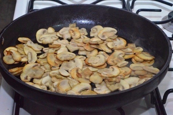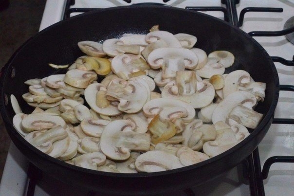 6. Одновременно разогрейте сковороду для грибов, добавьте одну столовую ложку оливкового масла, выложите грибы и посолите.