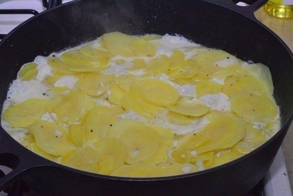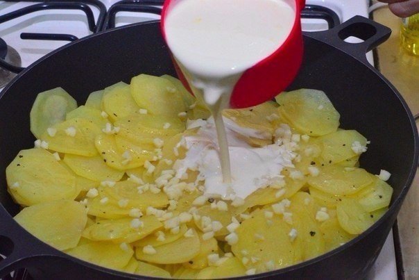 7. Как только ломтики картофеля становятся клейкими, добавьте чеснок и влейте сливки, ровно столько, сколько нужно для того, чтобы покрыть полностью ломтики картофеля, но не больше (как показала практика, можно и меньше), просто вкус будет менее жирный, но всё такой же насыщенный и сливочный.