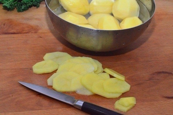 2. Разогрейте духовку до 200 ᵒС. Почистите и помойте картофель, затем нарежьте тонкими ломтиками по 2–3 мм.