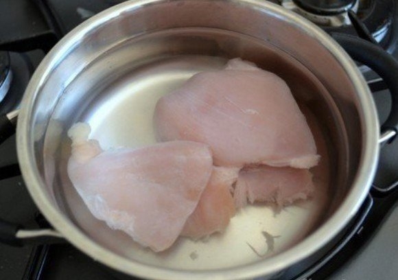 Куриное филе отварить в течение 20 минут с момента закипания. Остудить. Огурцы порезать средними кубиками.
