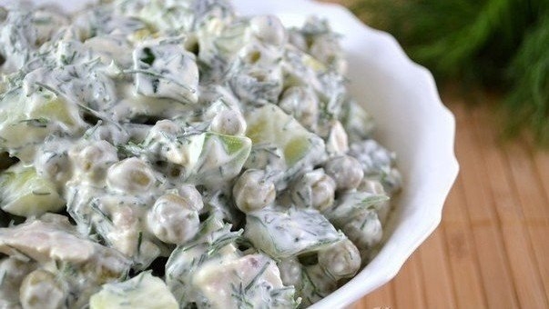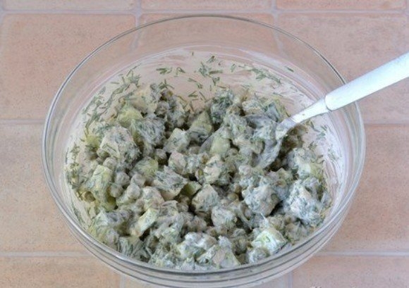 Сложить в салатник филе, огурцы, укроп, горошек. Добавить сметану, посолить, перемешать.