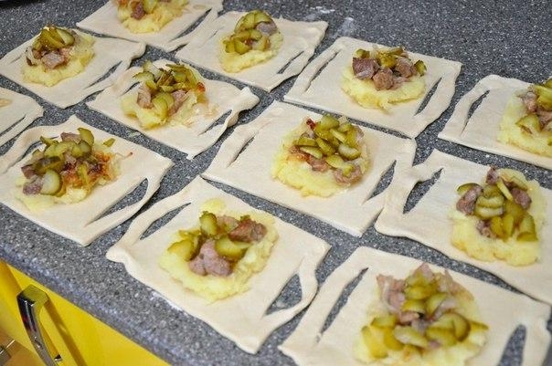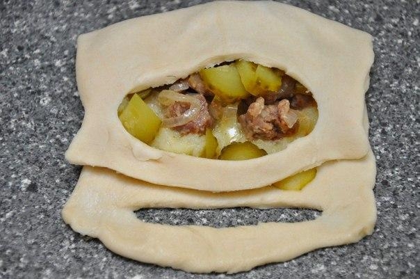 4. Выложить на тесто 1 ст. ложку картофеля и разровнять по поверхности. На картофель выложить мясо, на мясо — огурчики.