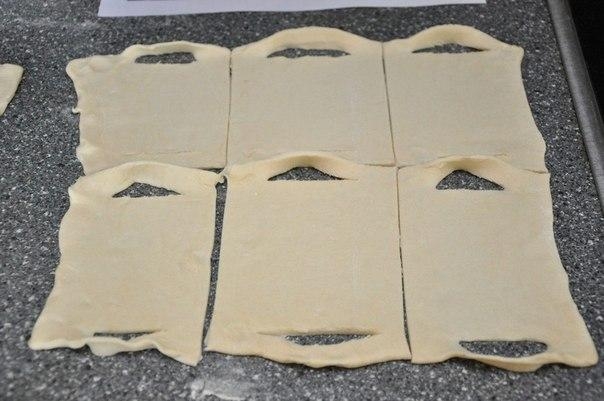 1. Пласты размороженного теста разрезать на 12 одинаковых прямоугольников.