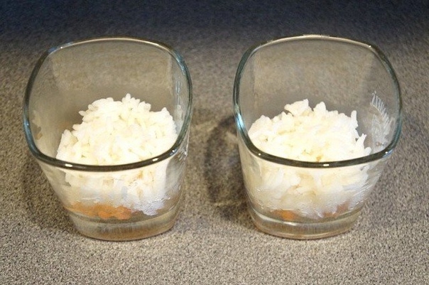2. Следующий слой — отварной остывший рис (можно заменить отварным картофелем, нарезанным кубиком).