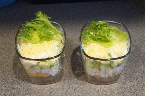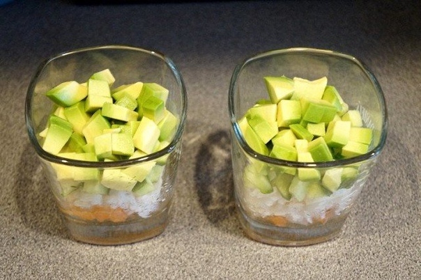 3. Дальше — нарезанные кубиками огурец и авокадо.