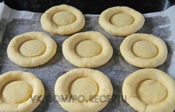 10. Положите начинку и слегка прижмите ее рукой. Смажьте ватрушки взбитым желтком.