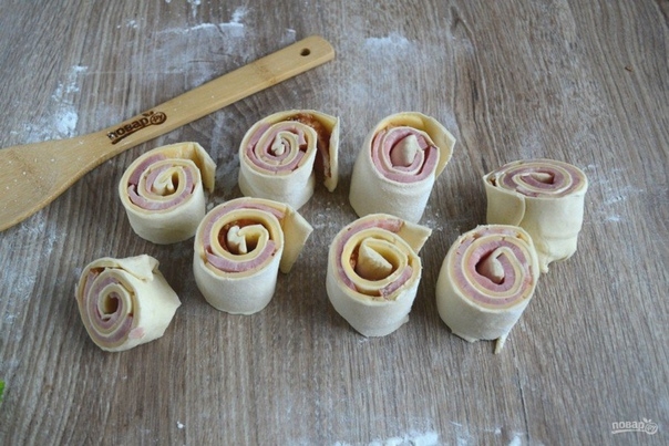 Порежьте на небольшие рулетики (шириной примерно 4 см.).
