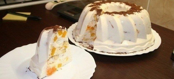 Нарезают печенье и фрукты, укладывают в формочки, заливая слои желейной молочной смесью.