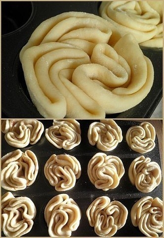 В принципе можно использовать любой джем, он не вытечет из булочек, так как они укладываются уголками вниз. Вкладываем их в ячейку формы для маффинов, уголком вниз по 3 лепешки в каждую: