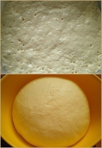 В опару добавляем остальные ингредиенты и щепотку соли, вымешиваем примерно 10 минут, пока тесто не станет мягким и эластичным.