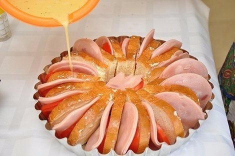 4. Между ломтиками батона положить дольки помидоров и ветчины.
