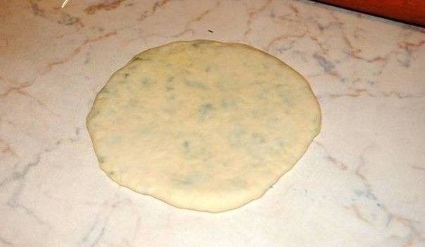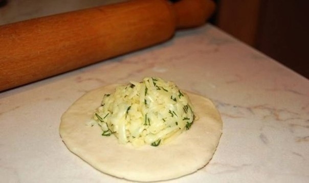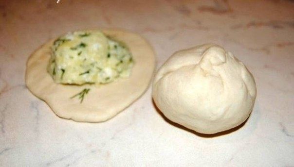 Тесто делим на кусочки, формируем из них руками лепёшки. На каждую лепёшку кладём начинку. Начинки должно быть по объёму столько же, сколько и теста.