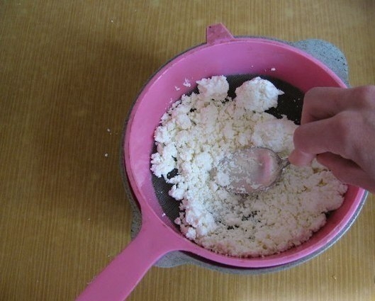 1. Творог, желательно домашний, протирается ложкой через сито. По идее, можно и через мясорубку, но мне показалось, что так он будет более нежным. Да и в старом рецепте было так написано.