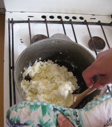 3. Ставим казан с этой смесью на маленький огонь и начинаем ложкой вымешивать всё это до однородной массы. По ходу дела добавляем специи - я посыпал сушёный базилик. Если хотите придать плавленому сыру желтоватый цвет - добавьте куркуму.