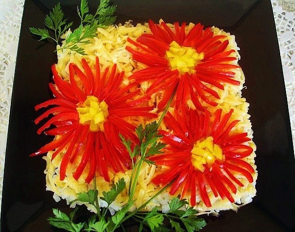 11. Украсить салат тоненькими полосочками красного перца, а серединки сделать из нарезанного желтого перца.