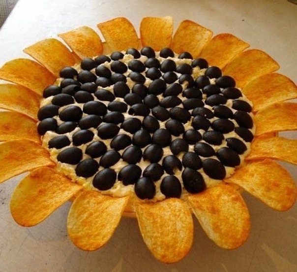 На круглое блюдо выложить филе, полить майонезом. Сверху выложить грибы, чуть меньшим диаметром, полить майонезом. Выложить белки, еще чуть меньшим диаметром, полить майонезом. Выложить сыр, покрыв уже весь салат, немного полить майонезом. Сверху посыпать желтками, постараться желтками покрыть всю поверхность салата. Маслины разрезать пополам вдоль и выложить по верху салата в виде “семечек”.