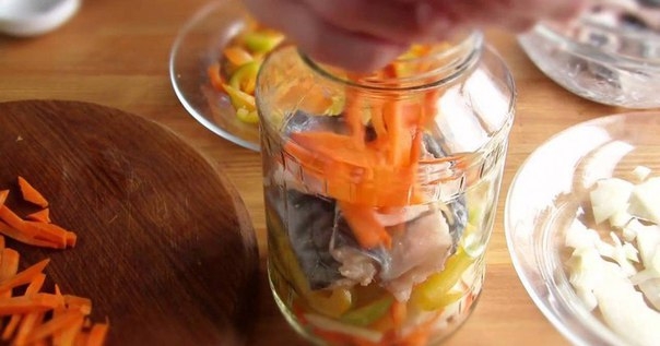 3. В 1,5л банку вниз положить лавровый лист и перец горошком,затем выкладываем слоями,чередуя порезанные овощи и скумбрию,овощи должны быть сверху банки