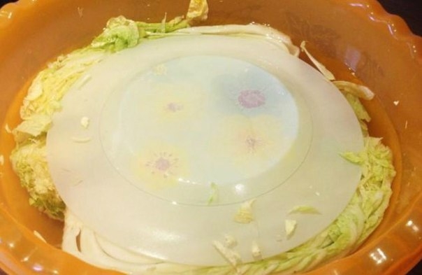 Кладем поверх капусты тарелку или крышку. Оставляем ее мариноваться при комнатной температуре на 12 часов. Лучше делать это с вечера, чтобы утром она была готова для дальнейших действий. Перед сном переверните разрезанные кочаны, чтобы они промариновались со всех сторон.