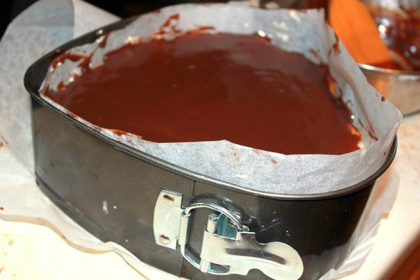 Добавьте приготовленный сливочно-яичный крем и тщательно перемешайте. Корж разрежьте горизонтально на 2 половины. Одну половину коржа уложите в глубокую форму, залейте кремом, накройте вторым коржом и оставьте застывать на 8 часов в холодильнике.