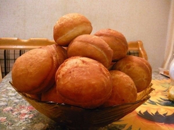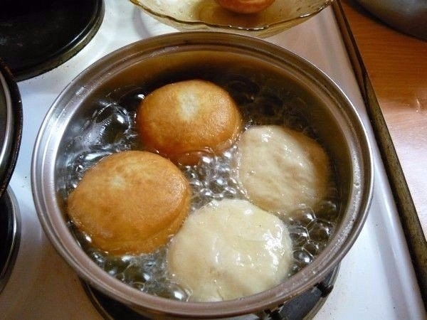 Получившиеся пончики опускаем в глубокую кастрюлю или сковороду с разогретым маслом. И жарим до золотистого цвета с двух сторон (следите за температурой масла: если масло будет слишком горячим, пончики снаружи сгорят, а внутри не пропекутся). Вытаскиваем и кладем на полотенце, чтобы стекло лишнее масло.
