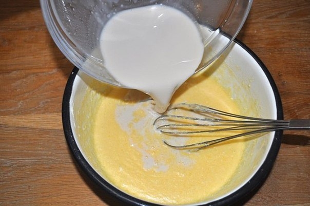 Сделай заготовку еще с вечера. Для этого смешай желтки, яйца, сахар и влей подогретое топленое молоко. Затем добавь прессованные дрожжи и растопленное масло. Перемешай все ингредиенты и поставь на 8–12 часов при комнатной температуре.