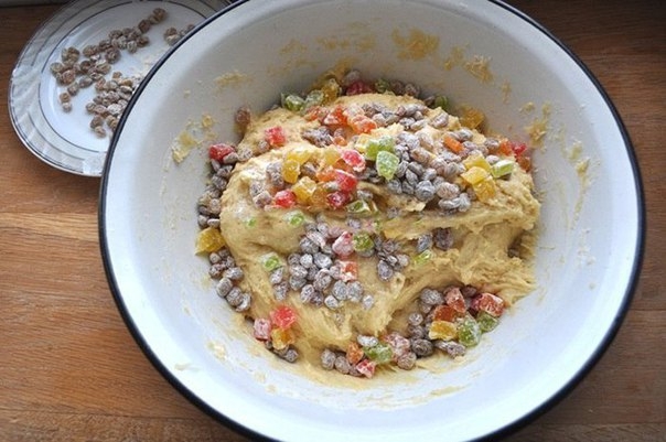 Изюм вымочи в коньяке и обсуши. Положи изюм и цукаты в тесто.