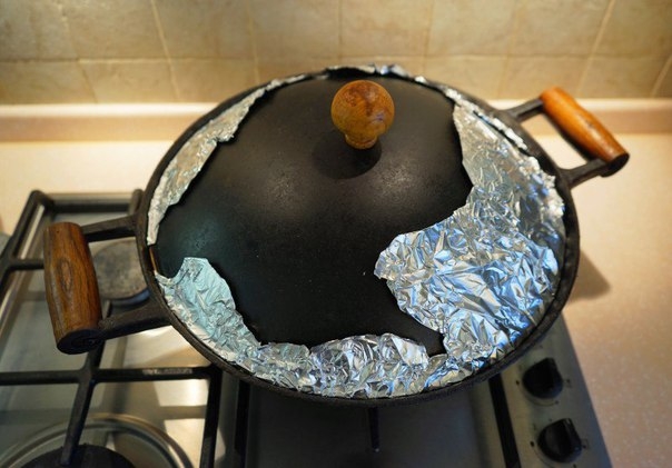 Врубаем огонь на всю катушку и как только дым полезет из под крышки, обинаем фольгу вокруг нее и засекаем 10 минут.