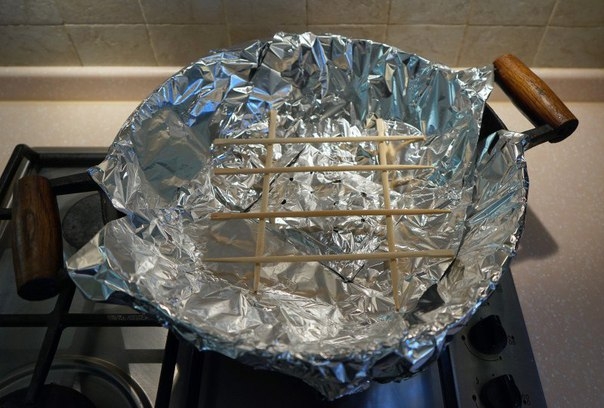 Выстилаем фольгой казан и "решетку" из китайских палочек для еды.