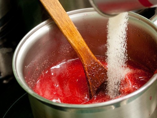 Пропустить через сито, добавить сахар и остальную воду. Все варить на медленном огне. Постепенно, помешивая, всыпать манную крупу и, продолжая помешивать, варить еще 5 минут.
