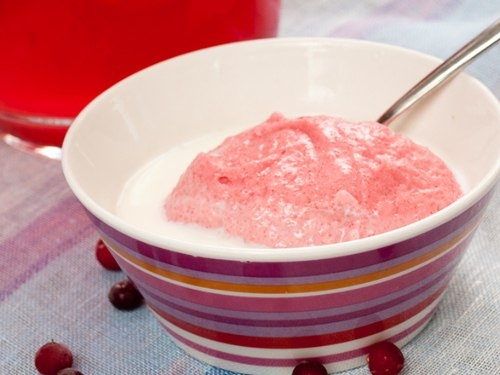 Полученную ягодно-манную массу охладить примерно до 30 градусов С. Если нужно приготовить десерт быстро, поставьте кастрюлю на холодную водяную баню. Если есть время, дайте массе остыть естественным образом. Взбивать – начиная с небольших оборотов миксера и постепенно увеличивать скорость. Чем дольше вы будете взбивать мусс, тем воздушнее получится ваша «манна небесная» – пышнее, светлее и, в конце концов – вкуснее.